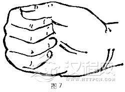 食、中、无名、小指内屈,四指末节急扣掌内,不能超过手掌第一道横纹,拇指封压食指孔眼,使手型如瓦楞形,用拳楞点打对方(图7)。