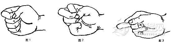 即手的无名指、中指和小指内屈,食指向内屈成勾,向外突出,拇指向内封压在中指屈眼上,五指紧握,用食指突出的部分点击对方要害部位(图1)。