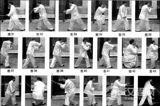 右脚抬起稍微离地左转180度,下踩重心移于右腿,同时,左脚提膝抬起置于右膝内侧,同时,右手持刺于胸前,左手护于右手腕(图34)。上动微停,左脚向前踩出呈虎步,随之展身,丹田抖劲,右手持刺由胸前摸押,向前点击,左手护右手背(图35)。