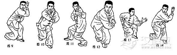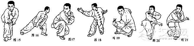 承上势,上前脚一大步,同时双手向前上方钻出,随迫上后脚过前脚,步成牮柱步,双手同时向后下捋拽捉下;双手到裆前,目前视,三尖照,六合合。收式用鹰捉、虎扑、雷声(图16)。