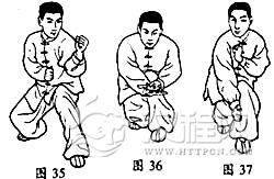 承上势,上前脚,同时前手下劈,再上后脚过前脚,后手绷出,接着上后脚步成弯套弯,双手在膝前相叠,目前视,有蓄而待发之意。接着前手向后捋、撕、拽、捉,后手同时向前下方劈出,两手有二争之劲,目前视,三尖照,六合合,头顶竖颈,含胸拔背,势如背锅,提肛收腹,舌抵上腭,下颌内收(图36、37)。