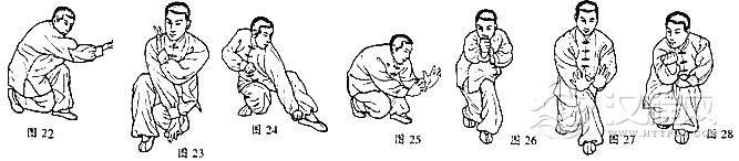 盘法:承第四手。重心在前,前膝弓,后膝蹬直,双手在裆前。接着上后脚向前,后手同日寸向内上起横钻而出到胸前,随上后脚催前脚进牛步,前脚虚点地后膝屈,后手向上钻至胸前在内,目前视,三尖照,六合合(图17)。