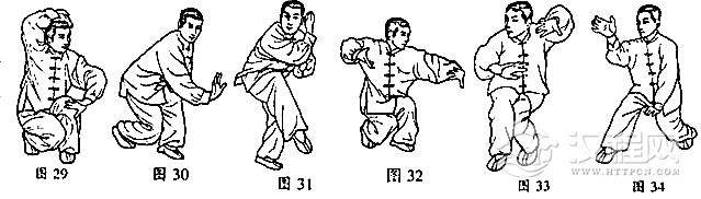 承上势,上前脚半步,前手向后分撩而出,后手从头向前下方劈出,接着上后脚过前脚,前手后捋,后手前推出,步成逆合的弯套弯步,目前视(图30)。