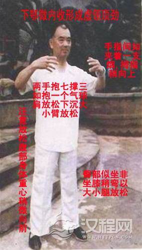站桩时要注意的地方已经在图中标出,练习时多看多想,力求做到准确、舒适、得力。练习时经常细细体会王老师的神态与姿势,会有 想不到的帮助。