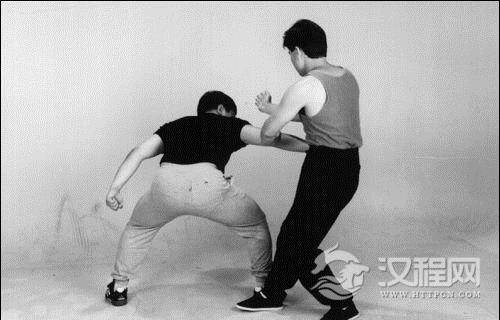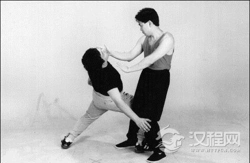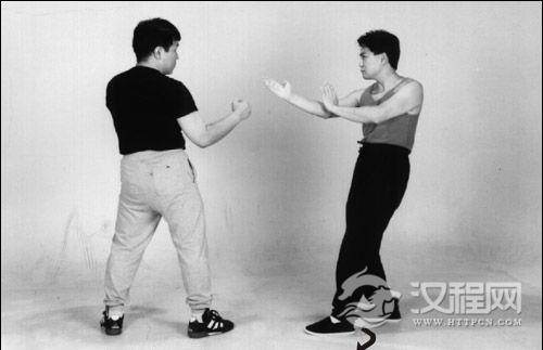 第三.运用步法化解。正如在上节中提到的一样,当一个人的静态身体结构和转马都不足以抵消对手的进攻时,必须运用步法化解。步法不但可以移动身体避开对方的攻击,亦可跟随对手的力流,佔据一个更有利的位置(即“ 引桥对肩”的位置,从这个位置进行反攻,与此同时身体的重量百分之百地保持在后腿上)。除此之外,步法的运用还有其他用途,包括全方位地缩短与对手的距离、粘著、困住和跟随对手的动作。与此同时,对手会不断地发现自己的动作被切断、被限制、或落入空处,没有反击的机会。