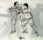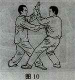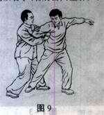 右侧之敌又用左拳(掌)击来,我即乘势向左前走履式。左手叼拿其腕,右手管其肘,或用我右肘里侧管住敌肘外侧(这叫里合肘),双手走下塌外碾之劲,向左前方将敌履发出去。即顺手牵羊之法。此式一定注意既走下弧,又要向左前发劲,不可只向左引,以防敌人乘势用左手臂向我左后施搂(平声)摔法。为此,此时要注意走外圈离心力,腰、腹、胯、腿都要向外运棚劲。周身走离心式的棚劲。同时,还要注意双手向左前履,右肩向右前靠,配合双手将敌人边履边靠合力发出。(图8、9)