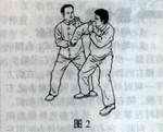 敌人从我右侧,双手抓我右臂施推按之劲,欲将我按瘪推出或推倒。我即乘势右臂下沉划弧随身左转,向左前下引进,使来力落空。引进时,我还可以以右手反拿敌右腕,使之上身前倾。在引进时,可以同时进右肩发靠劲,此谓“边引边靠””,“左引右靠”之法。(如1、2)