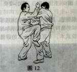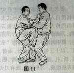 接上动作,在履敌使其不得势时,敌变招抓我双肘弯,上左步插我裆内,欲用肩靠,或用手将我推倒。此时,我臂肘迅速一开一合(先开后合),以双肘弯紧紧合击敌双手(也是一种拿法),同时,我双手进入敌胸部,准备将他推出。(10、11)