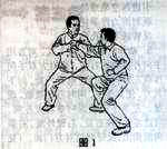 设另一种情况,敌被我履失势欲退,我迅速乘势左手拿住敌左手腕,用右肘由外于沉再挑击敌人左肋部。此时,我还可以用左胸靠击其左肘反关节。
