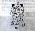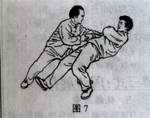 若敌此时从对面双手将我拦腰抱住,欲将我摔倒在地,我即松肩坠肘,含胸塌腰,屈膝向左下松沉,然后用双手臂合力反击敌之胸部、咽喉部,这样既可以解脱敌环抱之围困,又可以将敌发倒。但此时一定要注意双手肘向右上发劲,左臂必须下沉,以体现右发左塌之势,保持重心稳定。(图6、7)