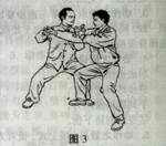 体现“引进落空合即出”的一个合劲。当我右臂引敌来力落空之际,我双手逆缠下沉(向左前侧下沉,此沉是为了欲上先下,欲右先左),双腕合住劲,准备用双肘、双手反击敌人。如上动作我用右手反拿敌人右腕下沉之后,我左手可以配合右手拿住敌人手腕准备边拿边发之。(图3)