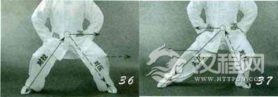 预备姿势:“命门”与两膝前后对拉,“开胯圆裆”成马步(图36)。