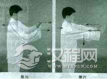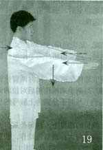 重复练习动作二和动作三,双手也可做向上斜推和回收或向下斜推和回收的动作,关键在于“大椎’要做反向的对应调节。以上练习甚至可在坐姿的情况下练习,通过长时间的练习可将上肢弓与主弓之间的调节有机地组合起来,并达到自动化的程度。如果将适当强度的橡皮筋分别固定于“大椎’、两手和两肘,进行以上的练习,可以达到更佳的练习效果(图19一图21)。