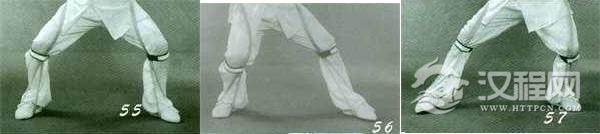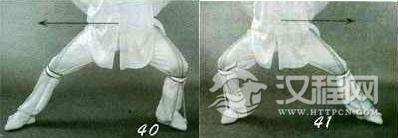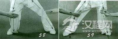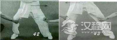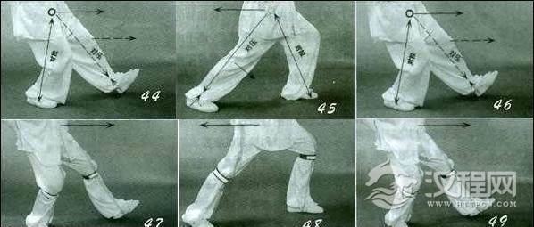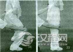 动作一:重心前移,“命门”逐渐与前脚底作弹性对压,加大在膝关节的弯曲变形蓄劲于膝;同时“命门”与后脚底作直线趋势的对拉,膝微屈,形成前压后拉的状态(图45)。