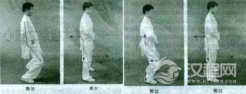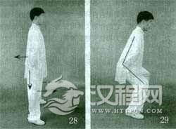动作一和动作二重复进行。练习时要保持开胯圆裆,特别要调节好“命门”与两膝对拉的平衡关系,如果“命门”后拉时两膝前拉之力太小而破坏平衡,将会产生突臀前俯之病(图29);如果“命门’后调之力不够,两膝会过分前屈而产生挺胯仰身之弊(图30)。