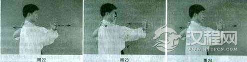 检验方法:利用橡皮筋作辅助器材的练习,本身也是一种很好的检验方法,可以十分直观地显示,当弓梢A、B之间作对拉撑开时,或者在弓梢A、B做相吸对压,弓把肘关节C做弧线弯曲变形时,均能产生和保持弹性力。另外也可在“大椎”和手施加等量方向相内的压力(图22),检查“大椎”与手在做对拉的过程中有否产生对应和等量的反向力(图23)。而在“大椎”与手在做相吸对压,弓把肘关节弯曲变形时有否积蓄更强的弹性势能(图24)。