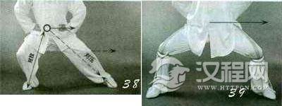 动作二:重心右移,“命门”逐渐与右脚底做弹性对压,蓄劲于右膝;同时左脚底与“命门”做反向对拉,膝弯屈,形成右压左拉的状态(图38)。