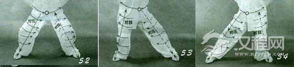 预备姿势:“命门”与两膝前后对拉。“开胯圆裆”成马步(图52)。