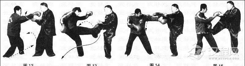 动作②乙右掌向内,向下,右脚向前猛踢甲腹部;甲同时右脚向前勾踢乙右大腿下部,左掌向前击乙。(图13)