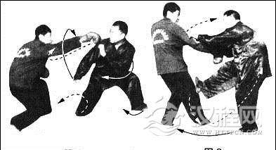 动作②甲身体重心向上,向右转约90°,右拳变挚向上捋乙击来右拳前臂向内;左掌击乙右肩前;同时右脚向前踹乙大腿上侧。(图2)