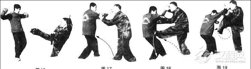 动作③甲左脚由前向下,踩碾乙右脚面,右脚向前勾挂乙左腿;同时右掌在前护己面部。(图19)