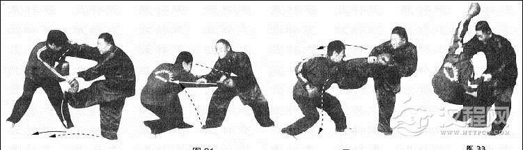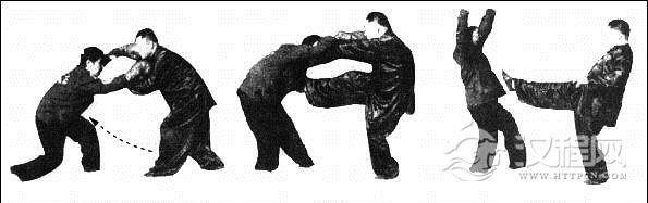 击法:此法是以败中取胜法、踩地寻金法、勇将脱袍法(捶法)转变形成的一套手、腿、摔合一的击技连击法,故称移花接木。