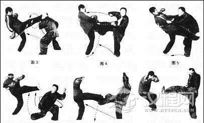 动作②甲右脚跟伺上磕乙踢来的右脚大腿下侧;同时上体旋身向右约180°,使身体朝乙正前方;同时右脚向上踢乙大腿内侧。(图7)