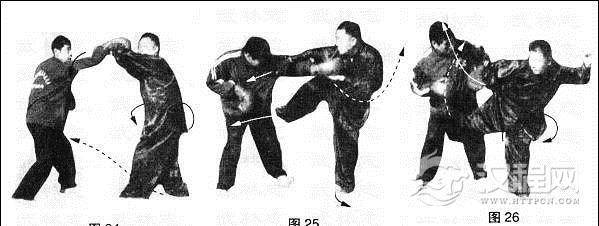 动作②乙左拳向前击甲胸部;甲右拳向前捋压乙左前臂。同时右膝屈提,上体向左转约90°。(图25)