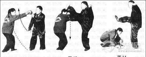 动作②甲腿突向上,向左,由乙头上向下猛劈击乙。将其击倒。(图10、11)