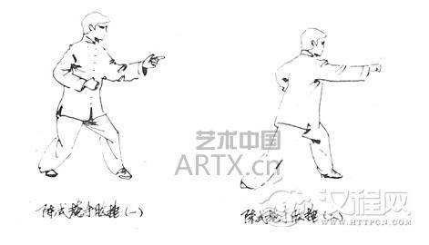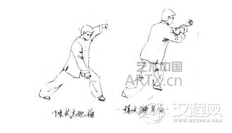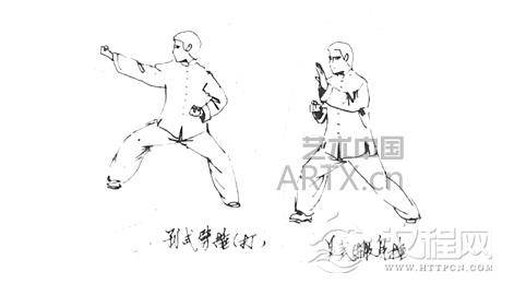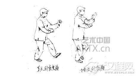 孙式:“肘下看捶”。左手微弯肘(似伸值),插掌在前(掌指朝前);右手为拳(拳眼向上、拳心向左)在左肘下,先左棚掌,而后右下拳。