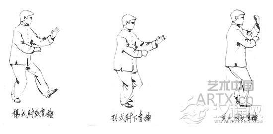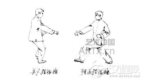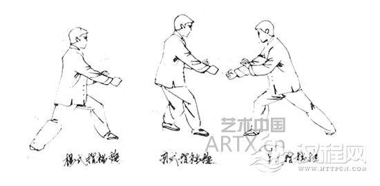 武式:略似孙式。两手在胸前同时向两侧微“捋”分,随后身体前移,上步跟步(左前右后),同时双手一起向前下伸出,左手向左侧“捋”化至胯旁,右手变拳向前下击去。