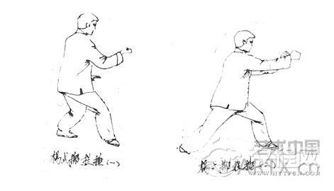 杨式:左手向下,向前、向左搂化(过左膝),身体前移。迈步为左弓步,右拳向下栽击。左手为“捋”劲。右手为“采”劲和“沉”劲相配合。