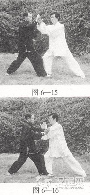 然后甲方领劲微向前 ,重心前移,松左胯,身微左转;乙方随甲方绷 劲微后履,重心略后移,松右胯,身微右转,甲方随乙方履劲,身体微右转,右臂用挤劲走下弧向上绷于乙方左臂下,同时左手在身体右侧按住乙方左手腕。与此同时,乙方重心后移,身体微左转,左手松开甲方右肘接甲方左手,右手松开甲方右手接甲方左肘变劲(图6—15、图6—16)。