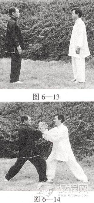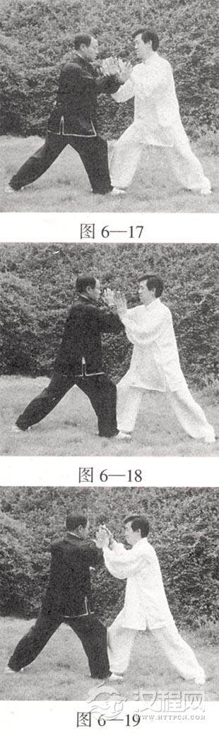 甲方重心前移,两手合力前按;乙身体微右转,双方绷住甲方右臂上履 ;甲方随沉肘松肩变挤劲还原成图6—16。如此反复练习,连绵不断。以上是甲方先领劲的练法。