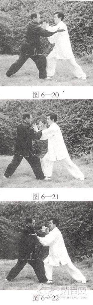 如果双方搭手后乙方先领劲,则甲方履,乙方挤;甲方按,乙方绷履 ;甲方挤,乙方按;甲方左手绷于乙方右臂下(图6—19至图6—22)。