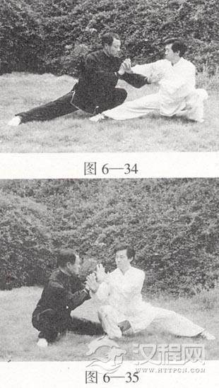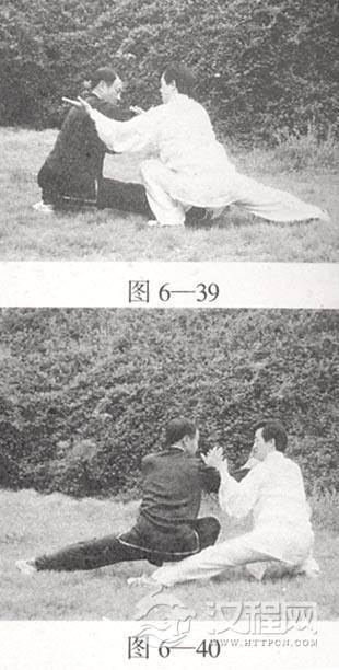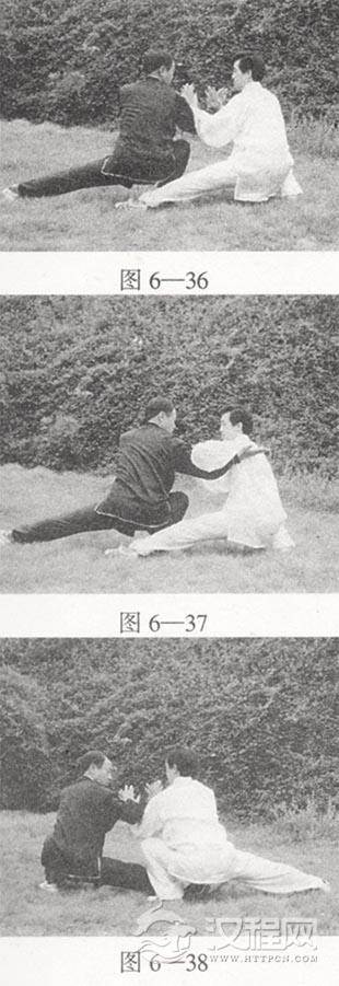 大履的推法,是在第三种顺步推手的基础上进行的一种推手法。如图6—33所示,按第三种方法推几圈,将周身各部位关节活动开后,身法运动幅度增大,双方均一腿屈一腿伸,仆步下势,手法与顺步推手相同。在行进中尽量让小腿肚辅地,随着手法绷、履 、挤、按的缠绕,双腿在下边左右盘旋(图6—34至图6—40)。