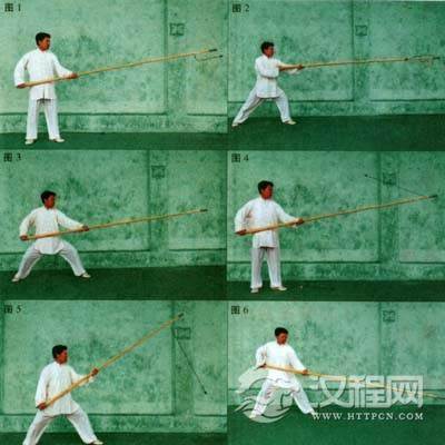 要求:两手持杆向右后划弧是蓄劲,后脚跟步是助力,进步上刺是在蓄劲基础上,发力一抖使劲达杆梢,注意要上下协调一致。