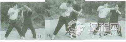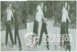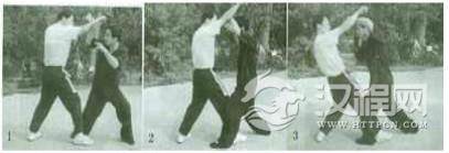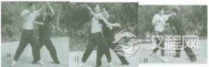 2.练法要求:甲方右手先接乙方右手腕部,左手随即托肘、松腰、作胯。上步要快,合住乙方腕和肘。下带上走动作要连贯,锁住乙方臂和腕。动作协调劲不断,快速旋转形成离心力。