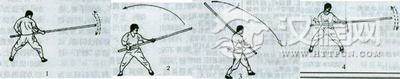 外扫抖 左手在前握持大杆,向左前方水平发力抖动,右手向右前方推动杆尾,形成争力。腰胯向左转,协同发力。反复练习(图12、13)。