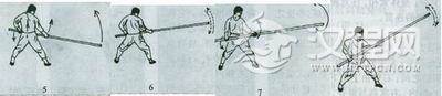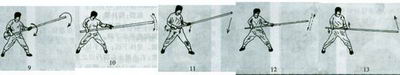 拿抖 左式站立,左手持杆顺时针向上、向内、向下按旋;右手顺时针向内、向下、向外提旋。腰胯向右转,协同身体发力。反复练习(图8、9)。