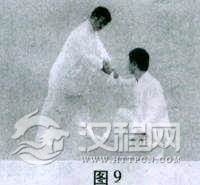 用法(六),对方右手刁拿我右腕。(1)右腕内拧,左掌切按,对方疼痛松手抽回,我随即出右拳击打对方腹部(图8);(2)左手控制对方右手使其不能抽回,右手外缠,擒拿对方(图9)。