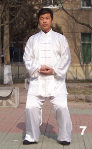 7、眼法不变向北。身略左转,胸向正前方。左腿变顺缠,弓膝塌裆劲,右腿变逆缠将右脚旋转踏在左脚的右旁约一肩宽,弓膝塌裆成小马步。落右脚时,也可以发劲有声,成震脚动作。同时左手顺缠从胸前下转到脐部,变小逆缠,手心略偏向右后,中指略指向右前上斜角。右手配合左手变小逆缠,贴左手掌心落下,拳心侧向左后上斜角,拳眼侧向右前上斜角(图1─7)。