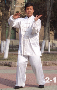2、眼法不变向北。身略右转,胸向右前斜角。右腿变顺缠,弓膝松裆塌劲以右脚跟为轴,向右前斜角外摆脚尖45°;左腿同时变逆缠,以左脚尖为轴,向左后斜角旋转脚跟,成右小盘步。同时右手变逆缠,以手领肘走外右上弧线向右上斜角上转,高与口齐,手心侧向右前下斜角,中指扬向左前上斜角;左手配合右手变顺缠,在原处松肩沉肘,下塌外碾,走里右小弧线,手心侧向右前上斜角,中指扬向左前上斜角,两手距离一肩宽(图2,2-1)。