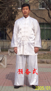 面、眼向正北。平心静气,周身放松,眼平视正前方。双腿分开一肩宽,自然站立。两手心向里松垂于两胯外侧(图一预备式)