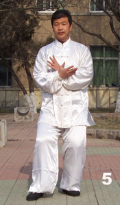 5、眼法不变向北。身继续左转,胸略向左前斜角。左腿仍顺缠,松裆弓膝,以脚跟为轴,脚掌贴地向正前方外摆脚尖;右腿仍逆缠,提膝走里前弧线,将右脚进到左脚的右前斜角约一肩宽落下,右脚平踏地面成右前虚步。同时左手继续逆缠,走里前上弧线转到下颏前,手心侧向右前下斜角,中指扬向右后上斜角:右手配合左手继续顺缠,肘贴右肋,以肘推手,走里右上弧线,转到左腕外下侧,手心侧向左后上斜角,中指扬向左前上斜角,左手在上,右手在下,呈斜“十”字状合抱胸前(图1─5)。