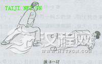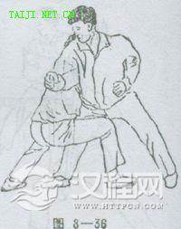 (3)接上势,甲方将乙方继续向右捋,让乙方失去反抗能力,同时迅速将重心移至右腿上,含胸、塌腰,周身上下蓄合,并将右肩沉下,落在乙方右肋处(图8—36)。