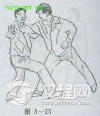 (2)接上势,甲方伸右手自左向右接住乙方右拳,甲方将重心移至左腿,抬右腿上步于乙方右腿内侧,甲乙双方两腿相接为宜,同时以左手搭在乙方大臂处,双手将乙方右臂捋向甲方身体右侧,使乙方丧失进攻能力(图8—35)。