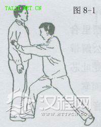 (1)甲乙双方正面站立,乙方上右步,并以双掌猛向甲方两臂中节推出(图8—1)。
