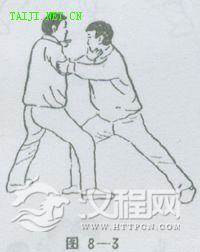 (3)接上势。待甲方右脚迈出的同时,两手先顺后逆缠搭于乙方两臂内侧,然后两臂随身体上提并外开,待乙方双手脱落至甲方两肘时,甲方身体螺旋下蹲。两手随之外翻,中气上行,沉肩,坠肘,开胸,劲达两臂,迫使乙方自动脱手(图8—3)。以静待动速上迎,以竖破直立点清,周身灵躯将未动,闭目掩耳也不中。
