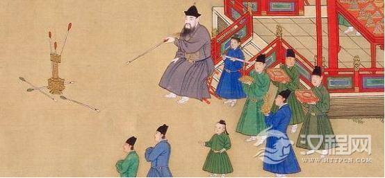 据《礼记·投壶》记载,以盛酒的壶口作标的,在一定的距离间投矢,以投入多少计筹决胜负,负者罚酒。常在宴会上玩,以助酒兴。